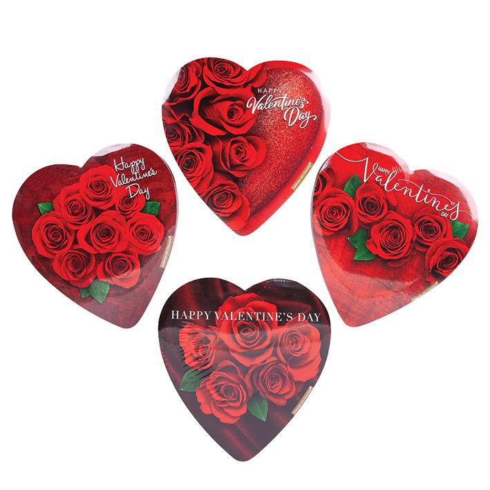 Heart shaped box filled with an assortment of Milk and dark ChocolatesBox design will varyrequests for specific box design cannot be honored at thhis time15 pieces per each 6oz heart