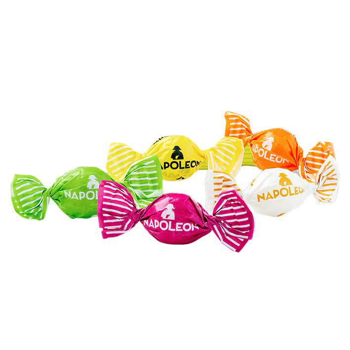 Hard candy with sour powder center Flavors include: orange, apple, cherry, lemon and pineapple Colors and flavors may vary Individually wrappedHalal • Vegan • Gluten free Approximately 64 pieces per pound
