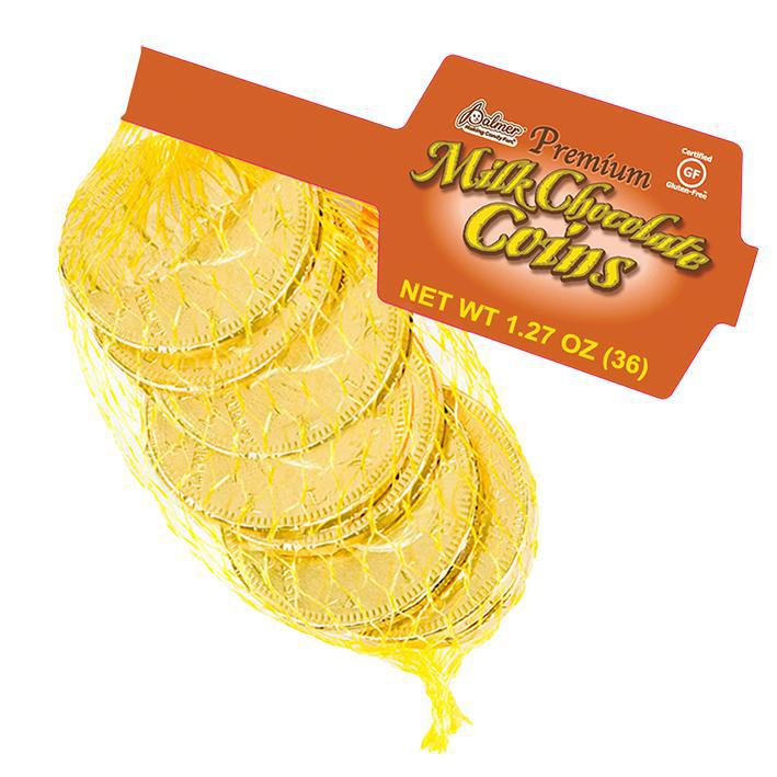 Milk chocolate Assorted american coin denominations Approximately 8 pieces per mesh bag Individually foil wrapped product of Israel Certified Gluten Free • Kosher OU-D chalav stam